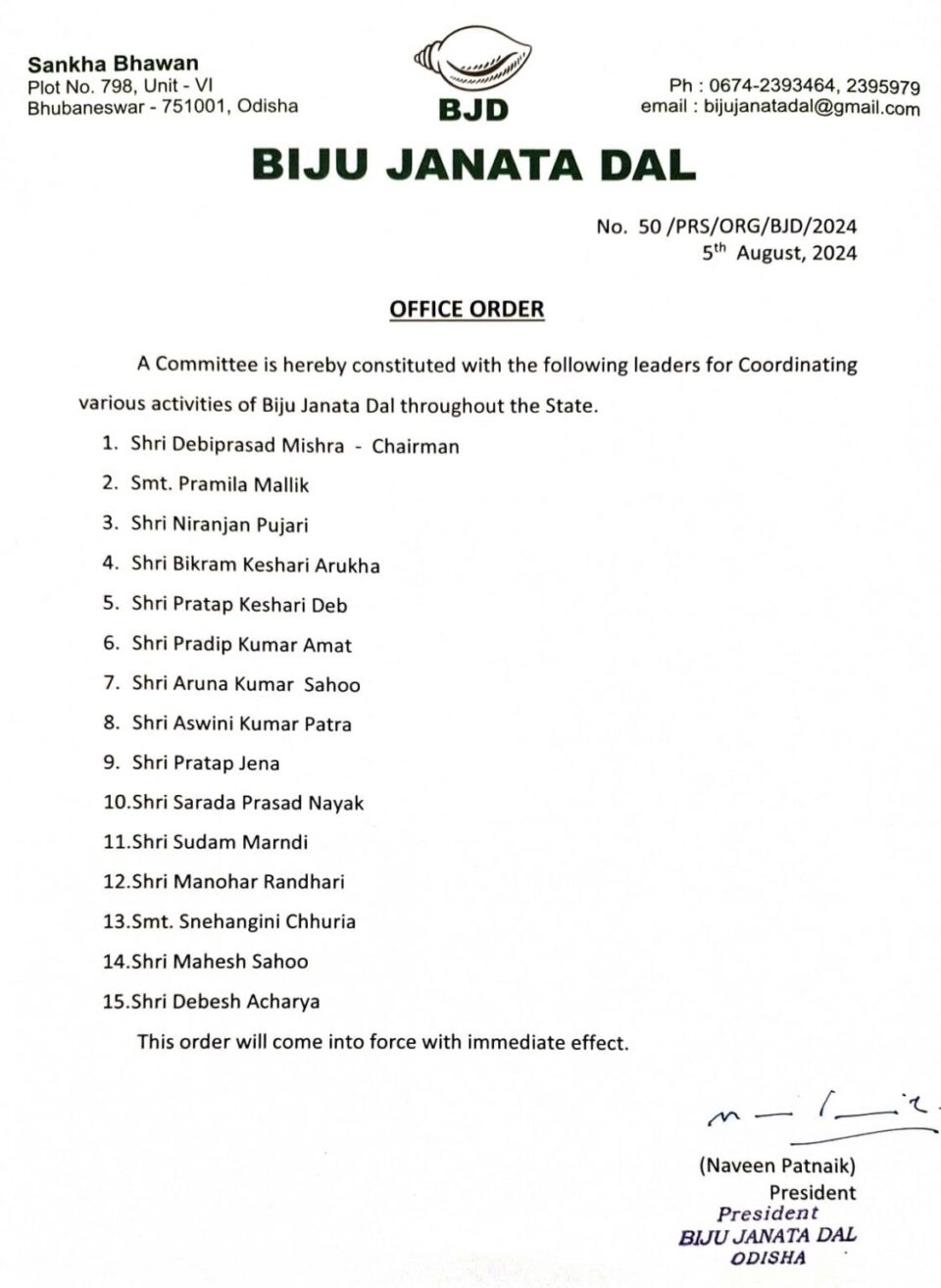 ନୂତନ କମିଟିର ଅଧ୍ୟକ୍ଷ ଅଛନ୍ତି ବରିଷ୍ଠ ନେତା ଦେବୀ ପ୍ରସାଦ ମିଶ୍ର । କମିଟିରେ ପ୍ରମିଳା ମଲ୍ଲିକ, ନିରଞ୍ଜନ ପୂଜାରୀ, ବିକ୍ରମ କେଶରୀ ଆରୁଖ, ପ୍ରତାପ କେଶରୀ ଦେବ, ପ୍ରଦୀପ କୁମାର ଅମାତ, ଡ଼. ଅରୁଣ କୁମାର ସାହୁ, ଅଶ୍ବିନୀ କୁମାର ପାତ୍ର, ପ୍ରତାପ ଜେନା, ସାରଦା ପ୍ରସାଦ ନାୟକ, ସୁଦାମ ମାର୍ଣ୍ଡି, ମନୋହର ରନ୍ଧାରୀ, ସ୍ନେହାଙ୍ଗିନୀ ଛୁରିଆ, ମହେଶ ସାହୁ ଓ ଦେବେଶ ଆଚାର୍ଯ୍ୟ ଅଛନ୍ତି ।