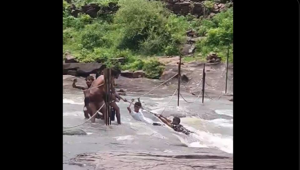 ୨ ଜଣ ଯୁବକ ପ୍ରଖର ଜଳ ସ୍ରୋତରେ ଫସି ରହିଥିବା ଭିଡିଓରେ ଦେଖିବାକୁ ମିଳୁଛି । ନିଜ ଜୀବନ ରକ୍ଷା କରିବା ପାଇଁ ଝରଣା କଡରେ ଲାଗିଥିବା ଚେନକୁ ଧରିଛନ୍ତି । ଏହି ସମୟରେ ଜଣେ ଯୁବକଙ୍କ ହାତ ଖସି ଯାଉଛି ଏବଂ ପାଣିର ପ୍ରଖର ସ୍ରୋତରେ ସେ କିଛି ବାଟ ଭାସି ଯାଉଛନ୍ତି ।