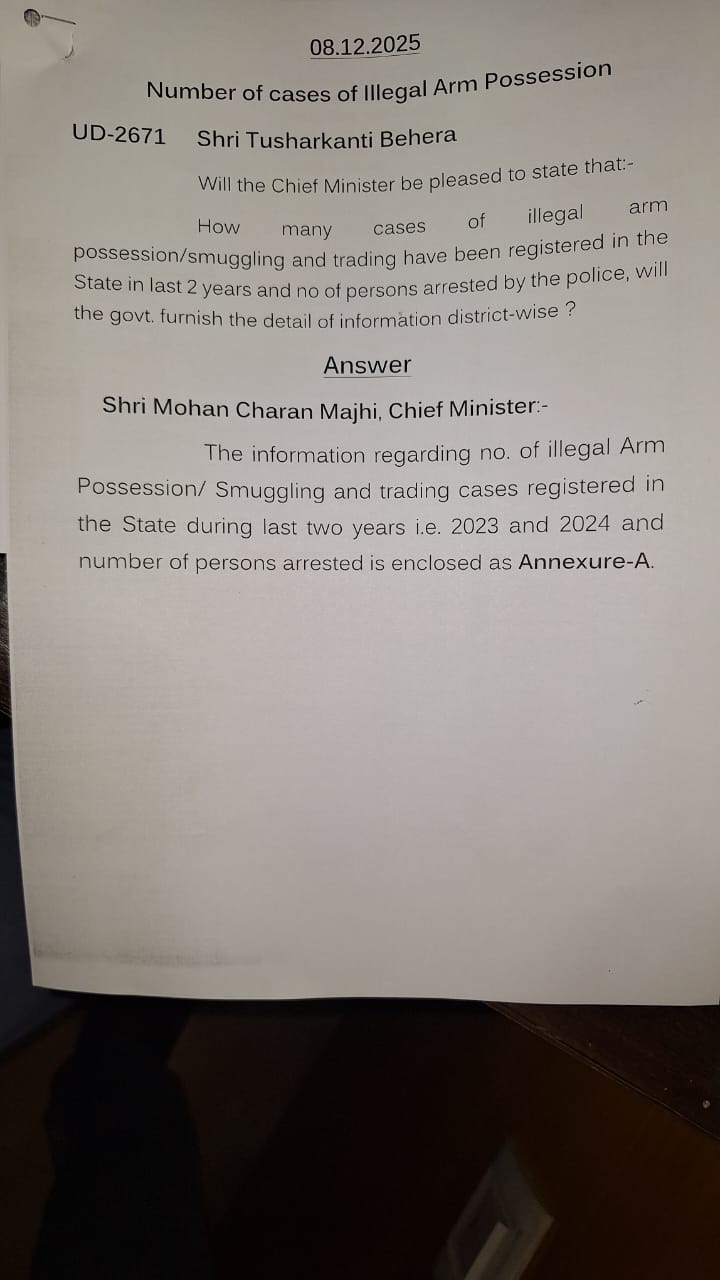 ଗୃହରେ ବିଧାୟକ ତୁଷାରକାନ୍ତି ବେହେରାଙ୍କ ପ୍ରଶ୍ନର, ଉତ୍ତର ରଖିଲେ ମୁଖ୍ୟମନ୍ତ୍ରୀ ମୋହନ ଚରଣ ମାଝୀ । ଓଡ଼ିଶାରେ ଚାଲିଛି ନକଲି ବନ୍ଧୁକ କାରବାର । ଗତ ୨ ବର୍ଷରେ ସାମ୍ନାକୁ ଆସିଲାଣି ୧୨୫୨ ମାମଲା । ନକଲି ବନ୍ଧୁକ କାରବାର ନେଇ ଗିରଫ ହେଲେଣି ୧୬୯୫ ଜଣ ଅଭିଯୁକ୍ତ ।
