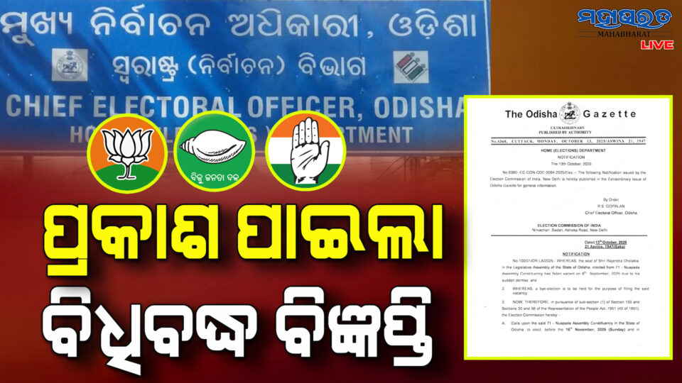 ଭୁବନେଶ୍ୱର:- ନୂଆପଡା ଉପନିର୍ବାଚନ ପାଇଁ ବିଧିବଦ୍ଧ ବିଜ୍ଞପ୍ତି ପ୍ରକାଶ ପାଇଛି । ନିର୍ବାଚନ କମିଶନଙ୍କ ଘୋଷଣା ମୁତାବକ ଆସନ୍ତା ନଭେମ୍ବର ୧୧ ତାରିଖରେ ନୂଆପଡା ଉପନିର୍ବାଚନ ପାଇଁ ଭୋଟ୍ ଗ୍ରହଣ ହେବ, ଏବଂ ୧୪ରେ ଭୋଟ ଗଣତି କରାଯାଇ, ଫଳାଫଳ ପ୍ରକାଶ ପାଇବ । ୧୬ତାରିଖ ସୁଦ୍ଧା ନୂଆପଡ଼ା ଉପନିର୍ବାଚନର ସମସ୍ତ ପ୍ରକ୍ରିୟା ଶେଷ ହେବ ବୋଲି ମୁଖ୍ୟ ନିର୍ବାଚନ ଅଧିକାରୀ ସୂଚନା ଦେଇଛନ୍ତି । ସେଥିପାଇଁ ଆଜିଠାରୁ ଆସନ୍ତା ୨୦ ତାରିଖ ପର୍ଯ୍ୟନ୍ତ ଆଶାୟୀ ପ୍ରାର୍ଥୀମାନେ ନାମାଙ୍କନ ଦାଖଲ କରିପାରିବେ । ଏହାପରେ ୨୨ରେ ପ୍ରାର୍ଥୀପତ୍ର ଯାଞ୍ଚ ଏବଂ ଚୂଡାନ୍ତ ପ୍ରାର୍ଥୀ ତାଲିକା ପ୍ରକାଶ କରାଯିବ । ଅକ୍ଟୋବର ୨୪ ପୂର୍ବରୁ ନାମାଙ୍କନ ପ୍ରତ୍ୟାହାର କରିପାରିବେ ପ୍ରାର୍ଥୀ ।