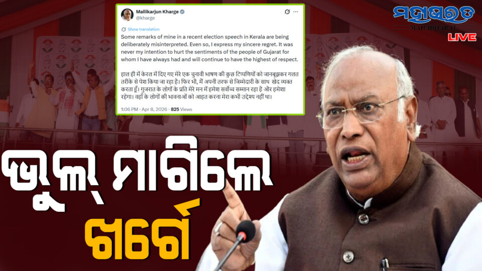 କଂଗ୍ରେସ ସଭାପତି ମଲ୍ଲିକାର୍ଜୁନ ଖାର୍ଗେ ଗୁଜୁରାଟର ଲୋକଙ୍କ ବିଷୟରେ ଦେଇଥିବା ମନ୍ତବ୍ୟ ପାଇଁ କ୍ଷମା ପ୍ରାର୍ଥନା କରିଛନ୍ତି। ସେ କହିଛନ୍ତି, “ମୁଁ ସବୁବେଳେ ଗୁଜୁରାଟର ଲୋକଙ୍କ ପ୍ରତି ସର୍ବୋଚ୍ଚ ସମ୍ମାନ ରଖିଆସିଛି ଏବଂ ରଖିବି। ସେମାନଙ୍କ ଭାବନାକୁ ଆଘାତ ଦେବା ମୋର କେବେ ଉଦ୍ଦେଶ୍ୟ ନଥିଲା।”